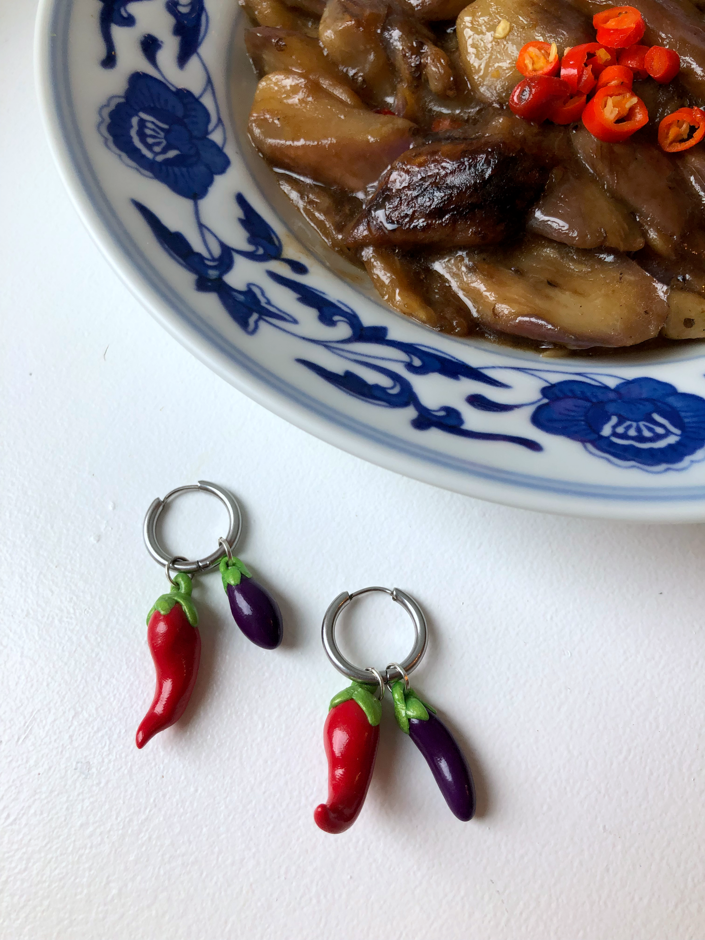 inspired by her mom’s chinese cooking, michelle handcrafts charms that represent vegetables in sichuan dishes such as spicy eggplant and spicy green beans. these are the staple vegetarian dishes that we order when we go out to eat at a chinese restaurant. now, we wear the miniature version on our ears and it makes us smile, as we feel connected to our parents and to each other. we hope it makes you smile too.